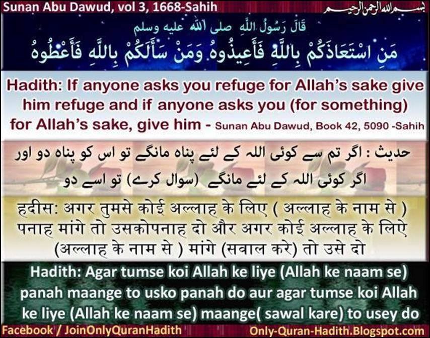 ► हदीस (हिंदी): हज़रत हज़रत इब्न अब्बास (रदी अल्लाहू अन्हु) से रिवायत है की रसूल-अल्लाह, मुहम्मद (ﷺ सलअल्लाहू अलैही वसल्लम) ने फरमाया - *“अगर तुम से कोई अल्लाह के लिए (अल्लाह के नाम से) पनाह मांगे तो उस को पनाह दो और अगर तुम से कोई अल्लाह के लिए (अल्लाह के नाम से) मांगे (सवाल करे) तो उसे दो।”* [सुनन अबू दाऊद, जिल्द 3, 1668-सहीह]
