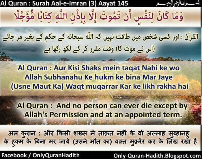 ✦ अल क़ुरान: *"और किसी शख्स में ताक़त नहीं के वो अल्लाह सुब्हानहु के हुक्म के बिना मर जाये (उसने मौत का) वक़्त मुक़र्रर कर के लिख रखा है ।"* [अल क़ुरान, सुरह आल-ए-इमरान (3), आयत 145]